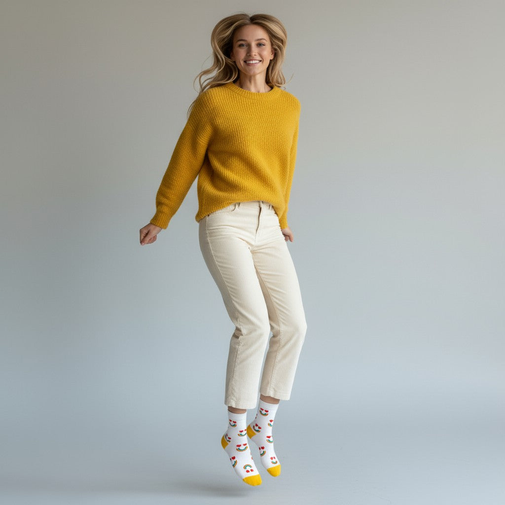 White socks with yellow toes, playful rainbows, and heart-shaped smiles—bright and cheerful for everyday fun.